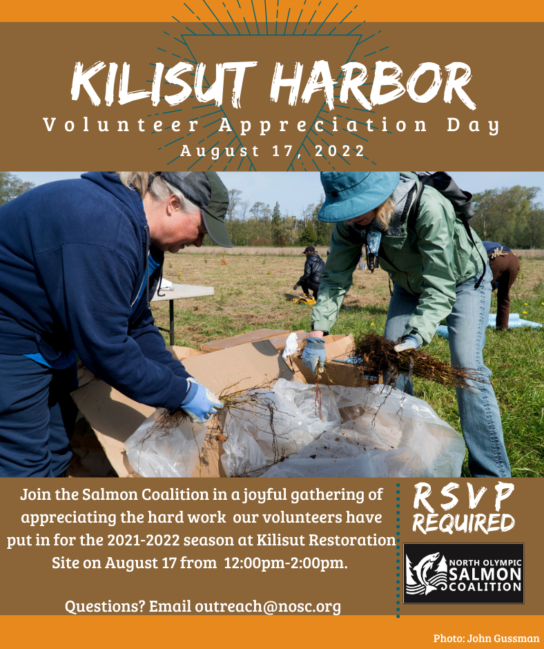 We would like to take a moment and thank all our volunteers who have participated in our volunteer events for the 2021-2022 season. This includes spending countless hours volunteering for spawner surveys, education programs, plantings, and maintenance events. Join the North Olympic Salmon Coalition for Volunteer Appreciation Day on August 17 at the Kilisut Harbor restoration site! Come gather with … Read More