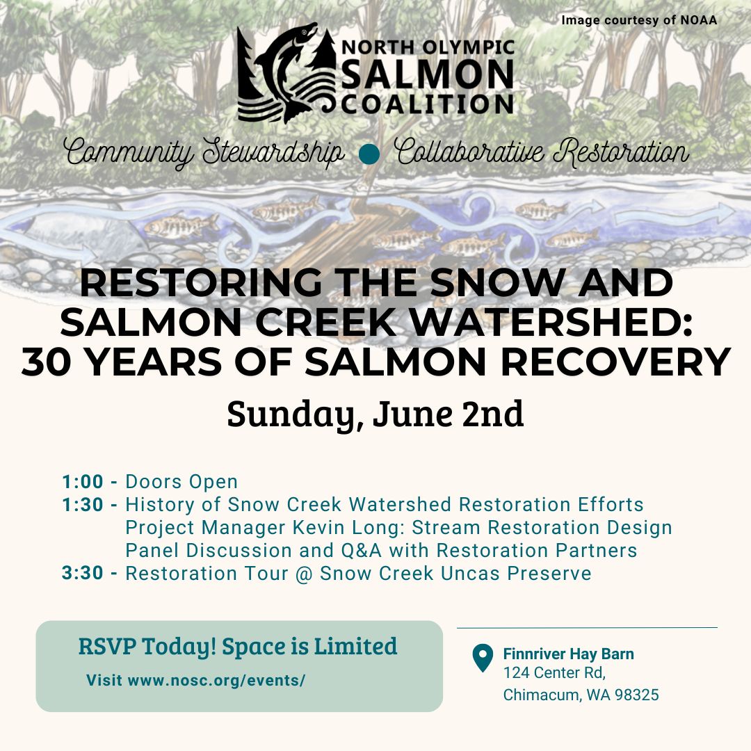 Flowing from the foothills of the Olympic Mountains to the salty waters of Discovery Bay, Snow Creek is home to coho, steelhead, and federally listed Hood Canal Summer Chum. The story of its restoration spans many decades of collaboration between the Salmon Coalition, Washington Department of Fish and Wildlife, Jefferson Land Trust, local landowners, and community members. Join us for an afternoon of exploring this watershed-wide effort in restoration.